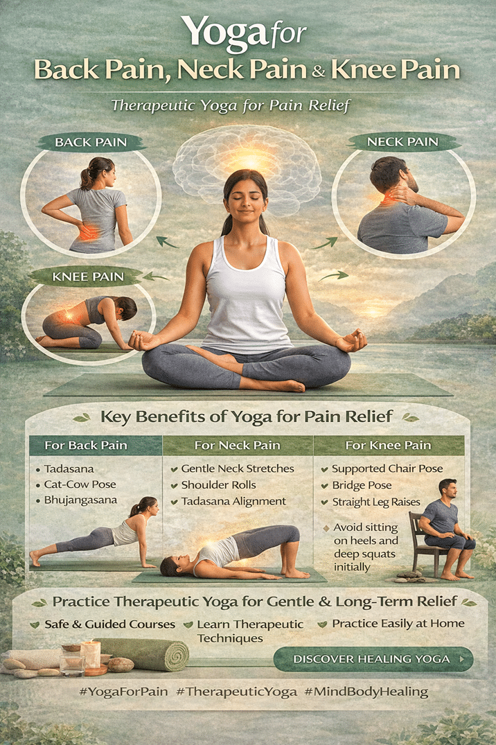 This blog explains how yoga helps back pain, neck pain, and knee pain safely, and how to practice without creating further damage.